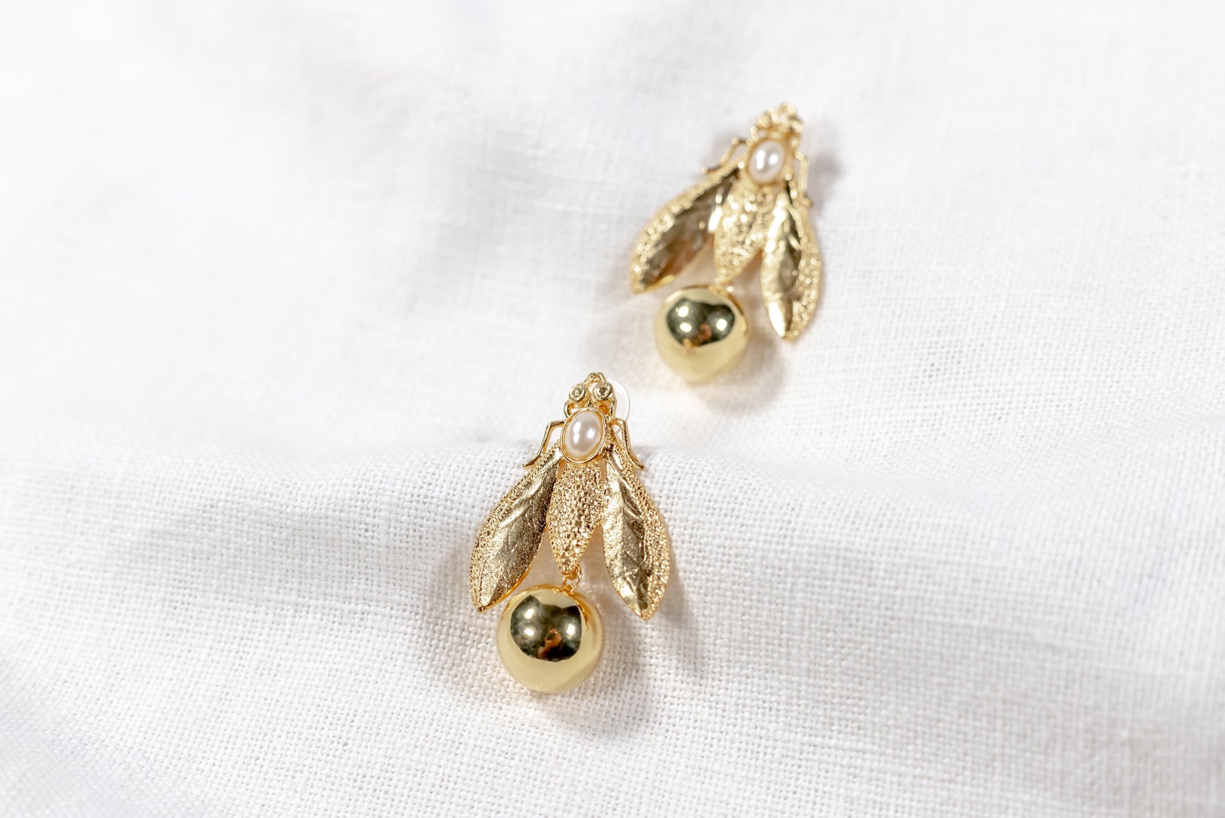 Pendiente en forma de gran mosca dorada y esfera. Bañado en oro 21kt.