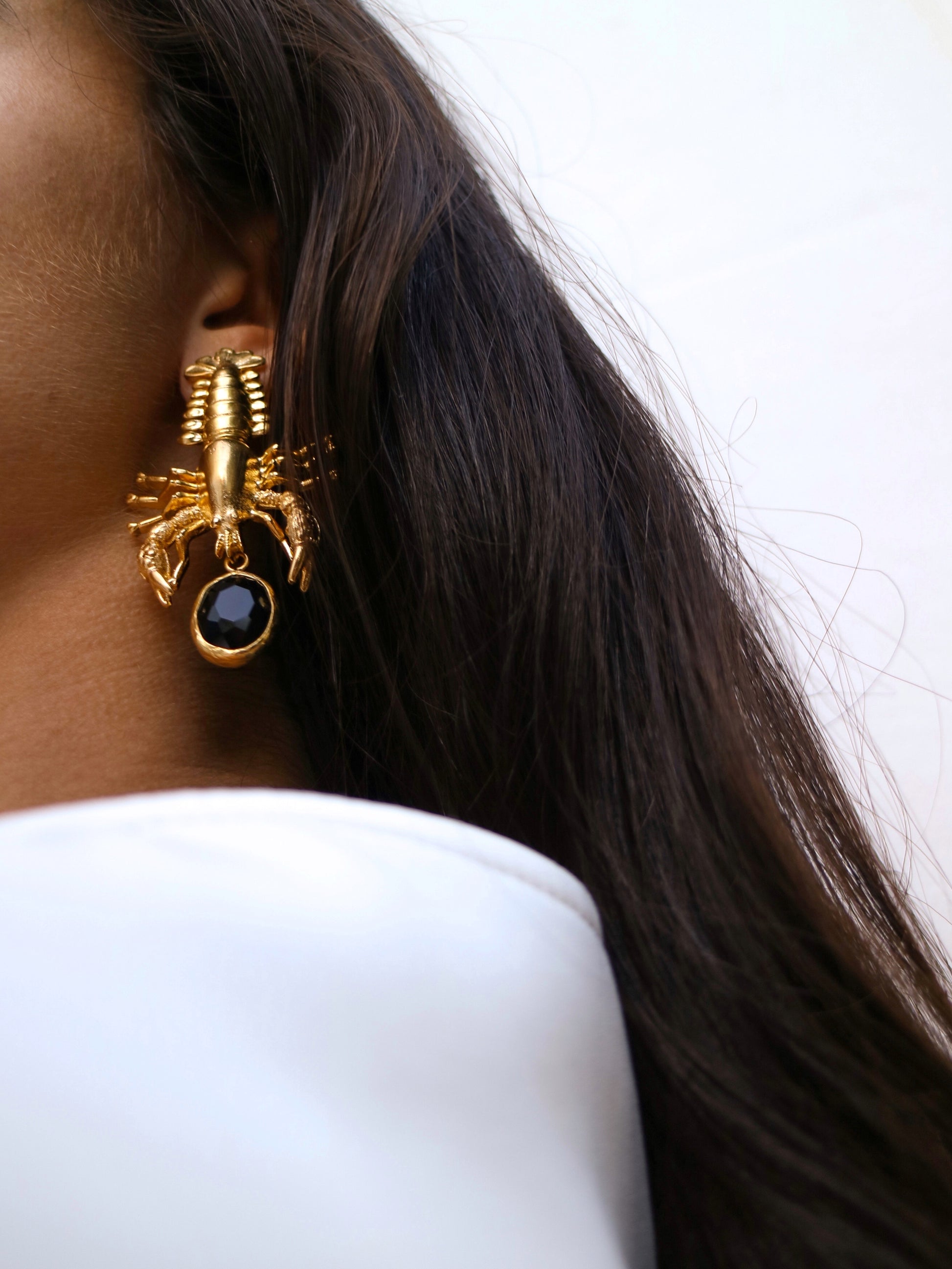 Langosta dorada con Ónix. Pertenece a nuestra colección más especial de pendientes bañada en oro de 21k.