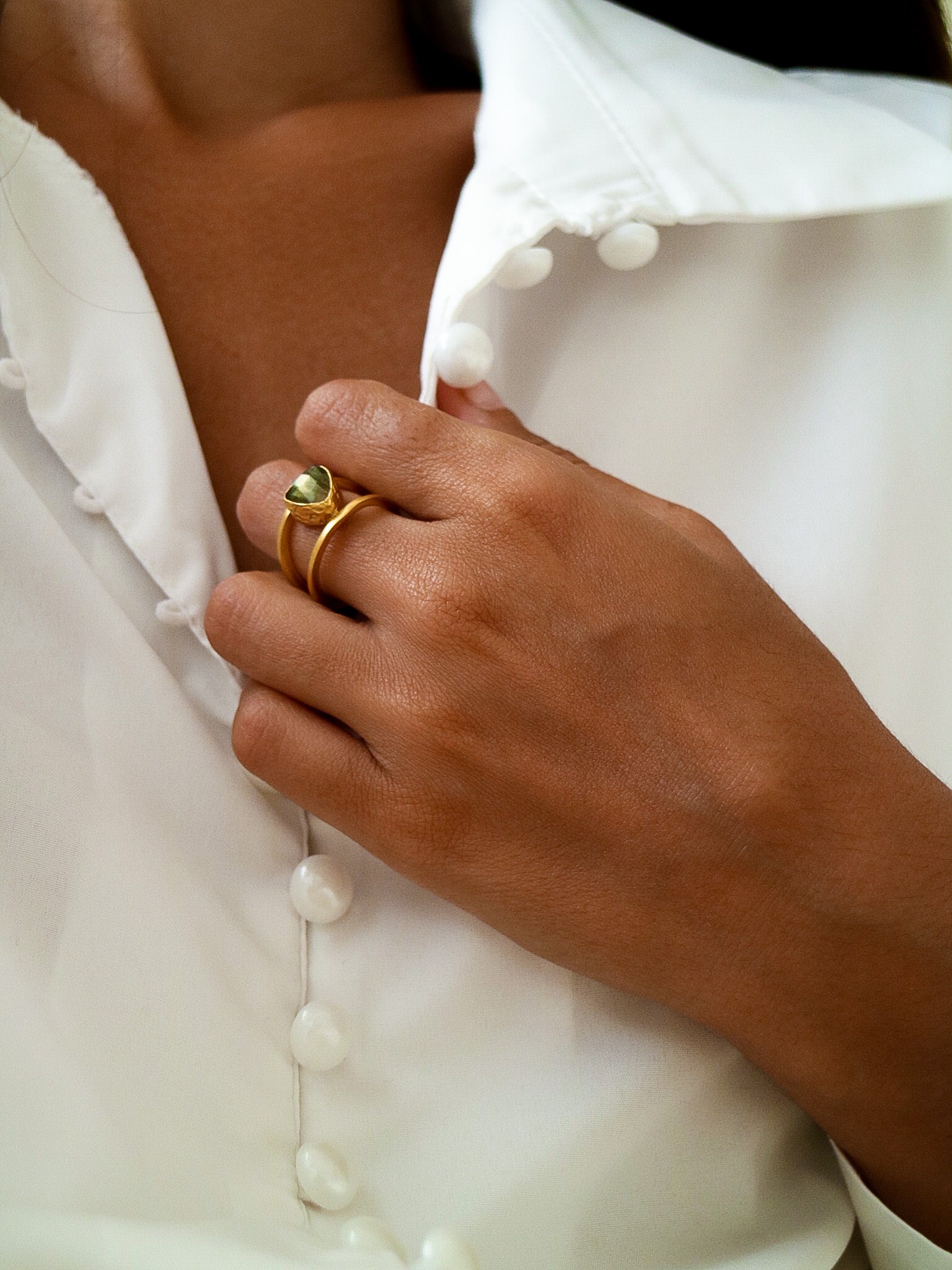 Anillo ajustable con labradorita en forma triangular. Bañado en oro de 21kt.