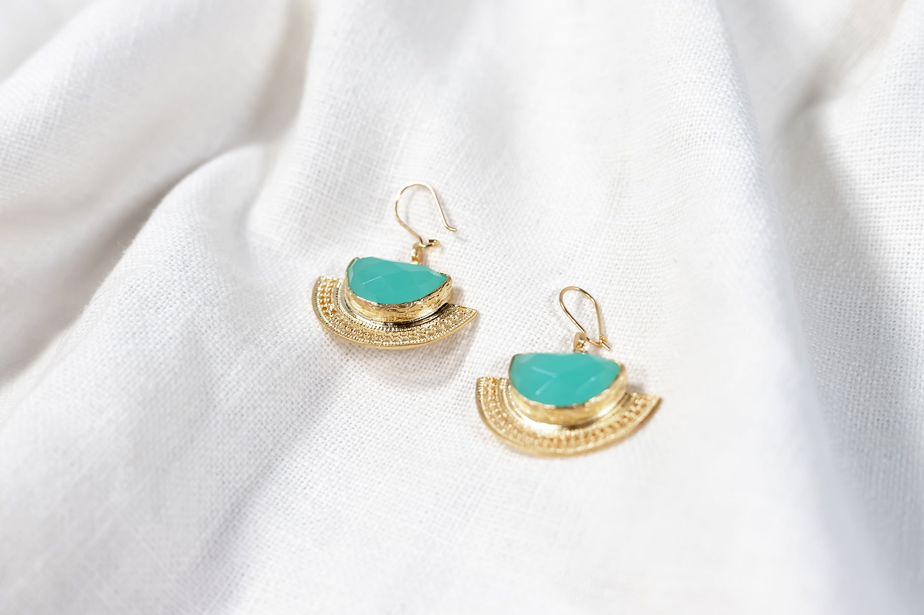Pendientes que evocan a la Antigüedad. Bañados en oro de 21kt con una piedra Aqua Calcedonia central en forma de media luna.