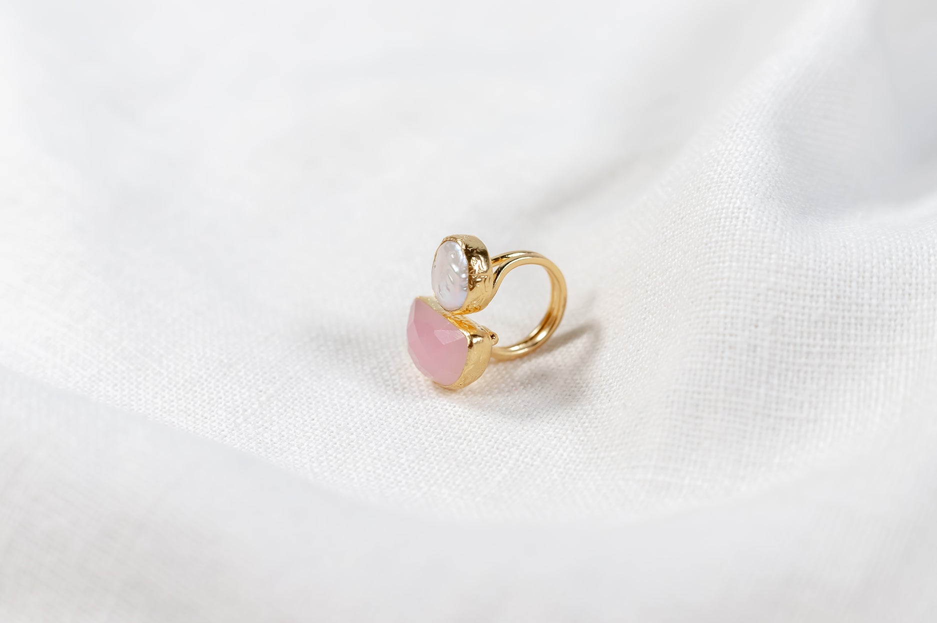 Anillo en forma de media luna de cuarzo rosa y perla circular. Bañado en oro de 21kt.