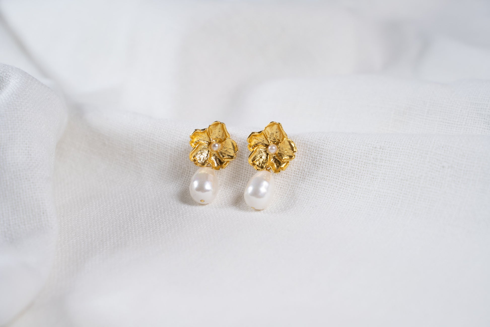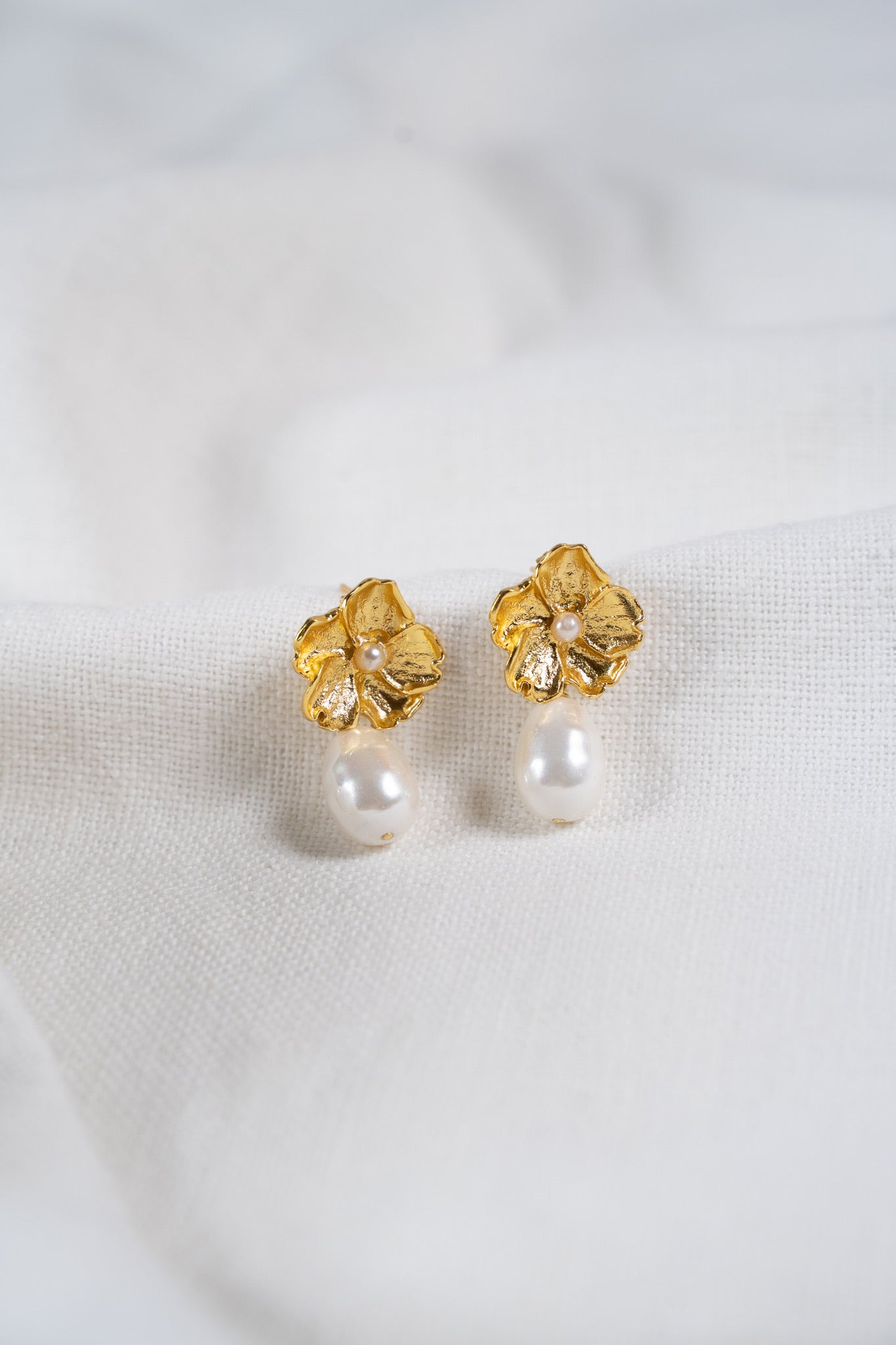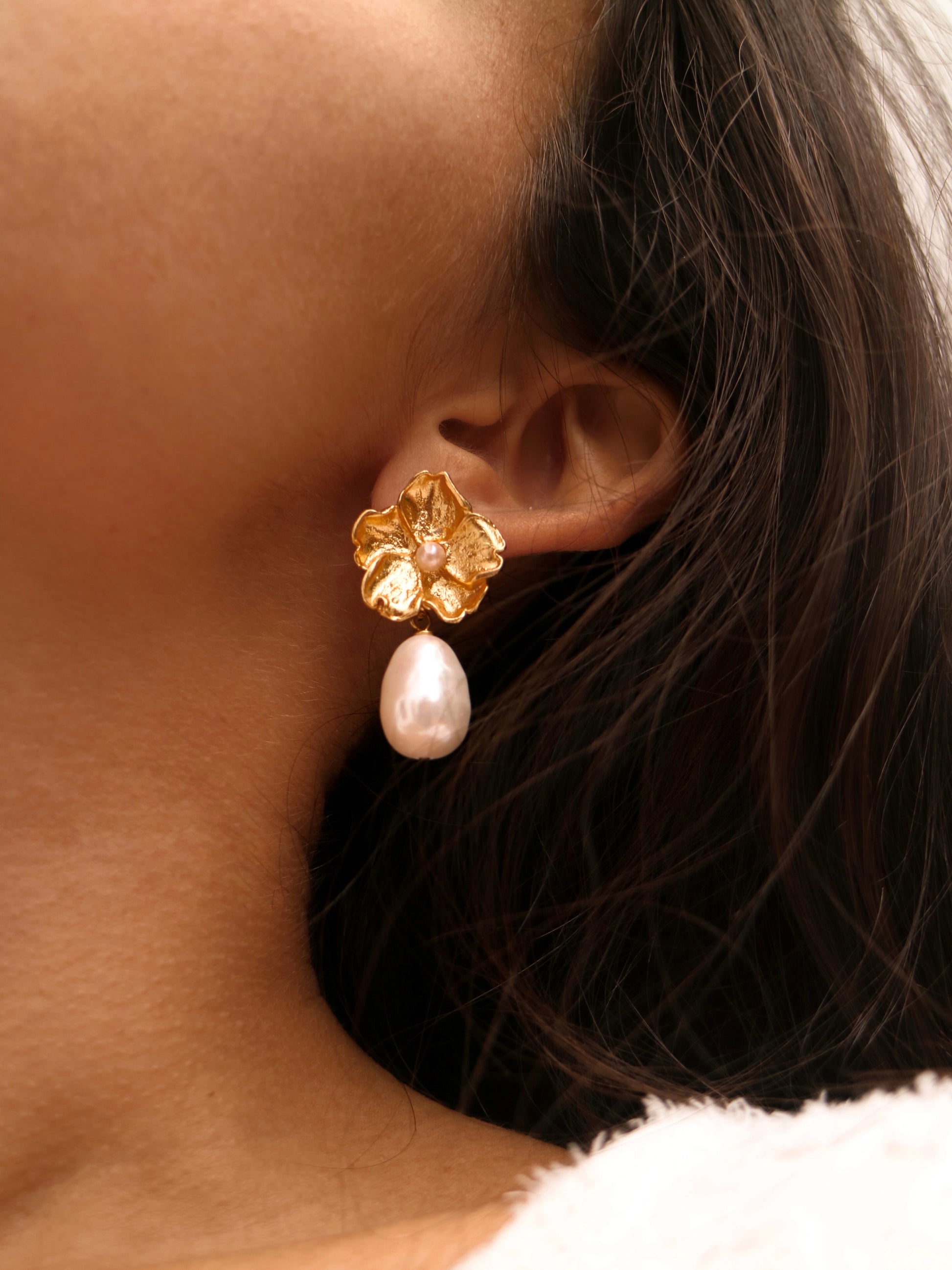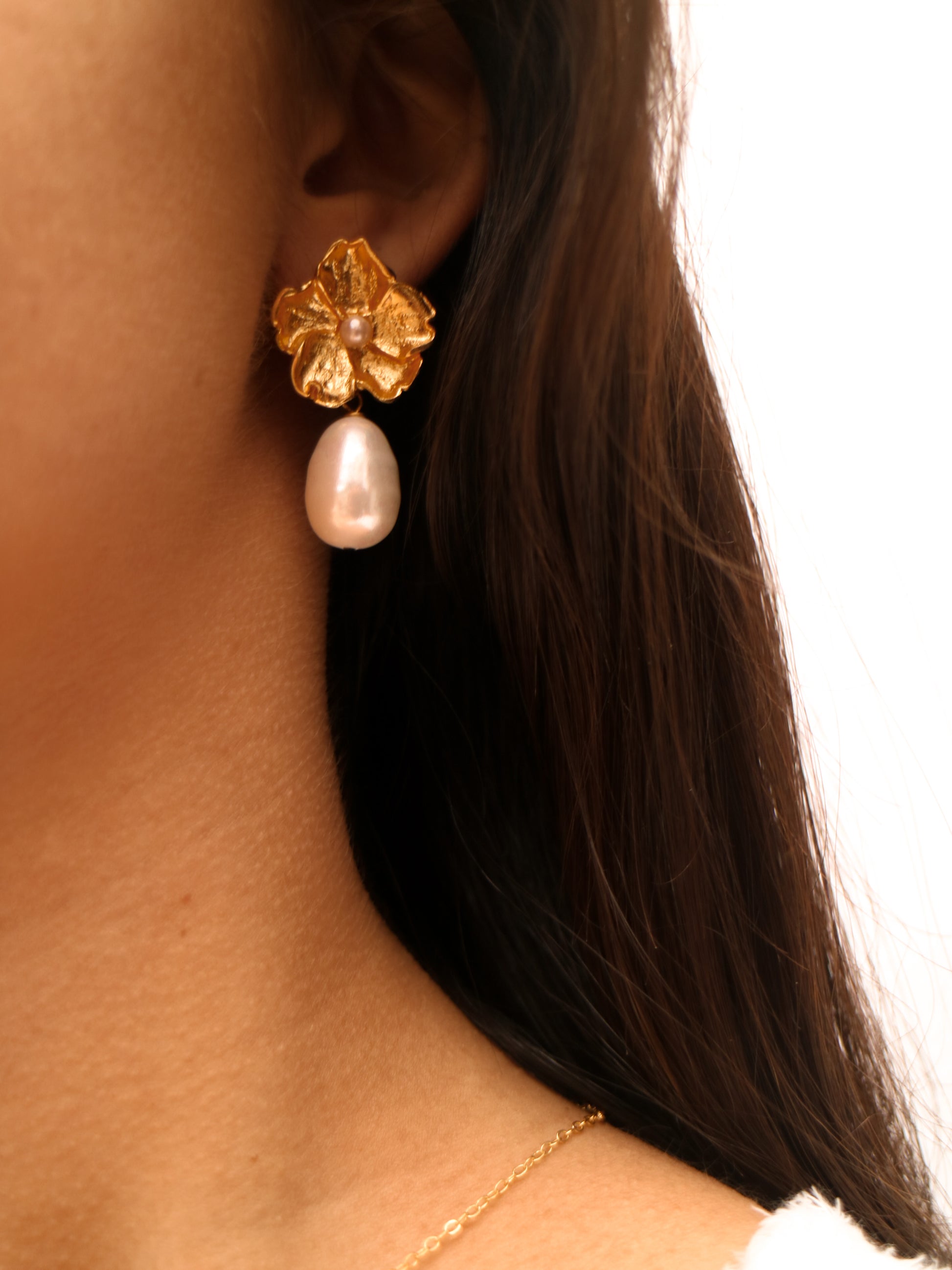 Pendiente en forma de flor dorada con perla colgante es un complemento ideal con el que no pasarás desapercibida.