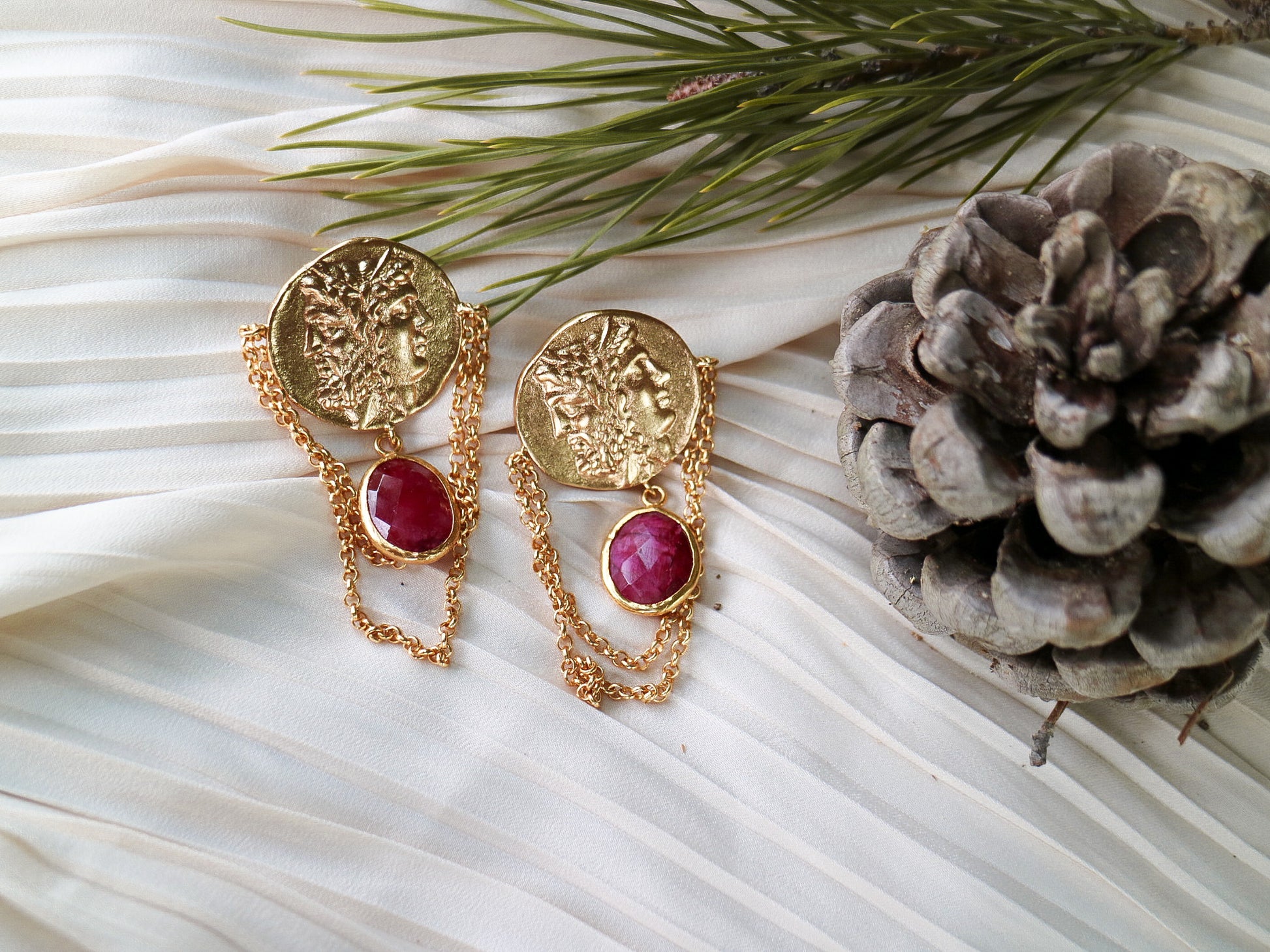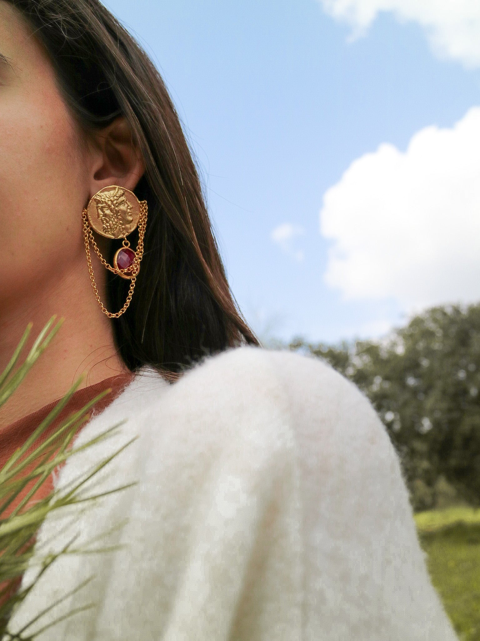Pendientes con forma de moneda antigua, dos cadenas colgantes y una piedra de ojo de gato. Bañados en oro de 21k.