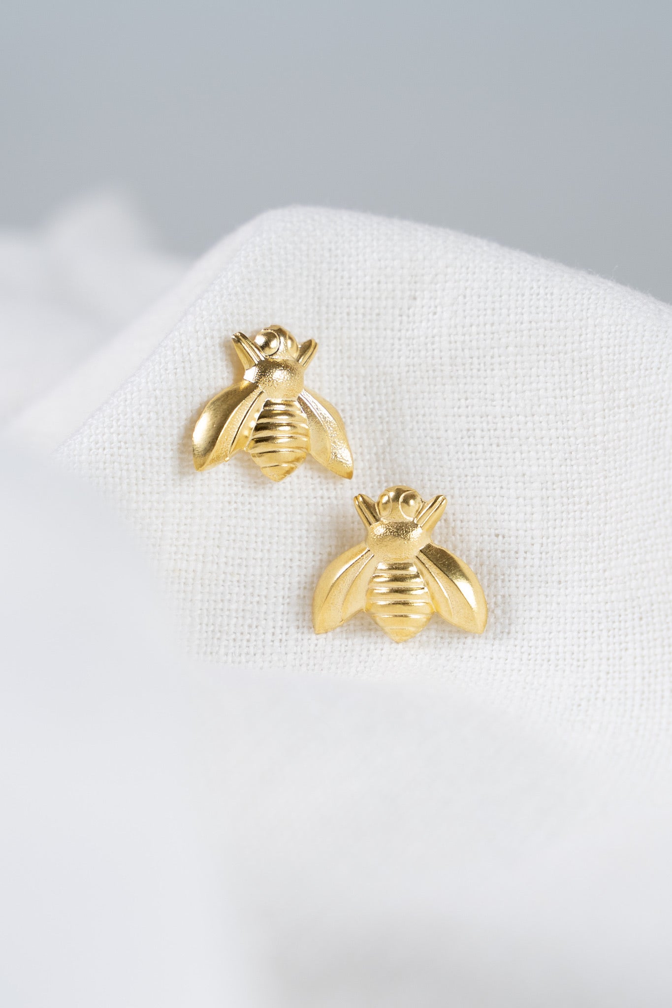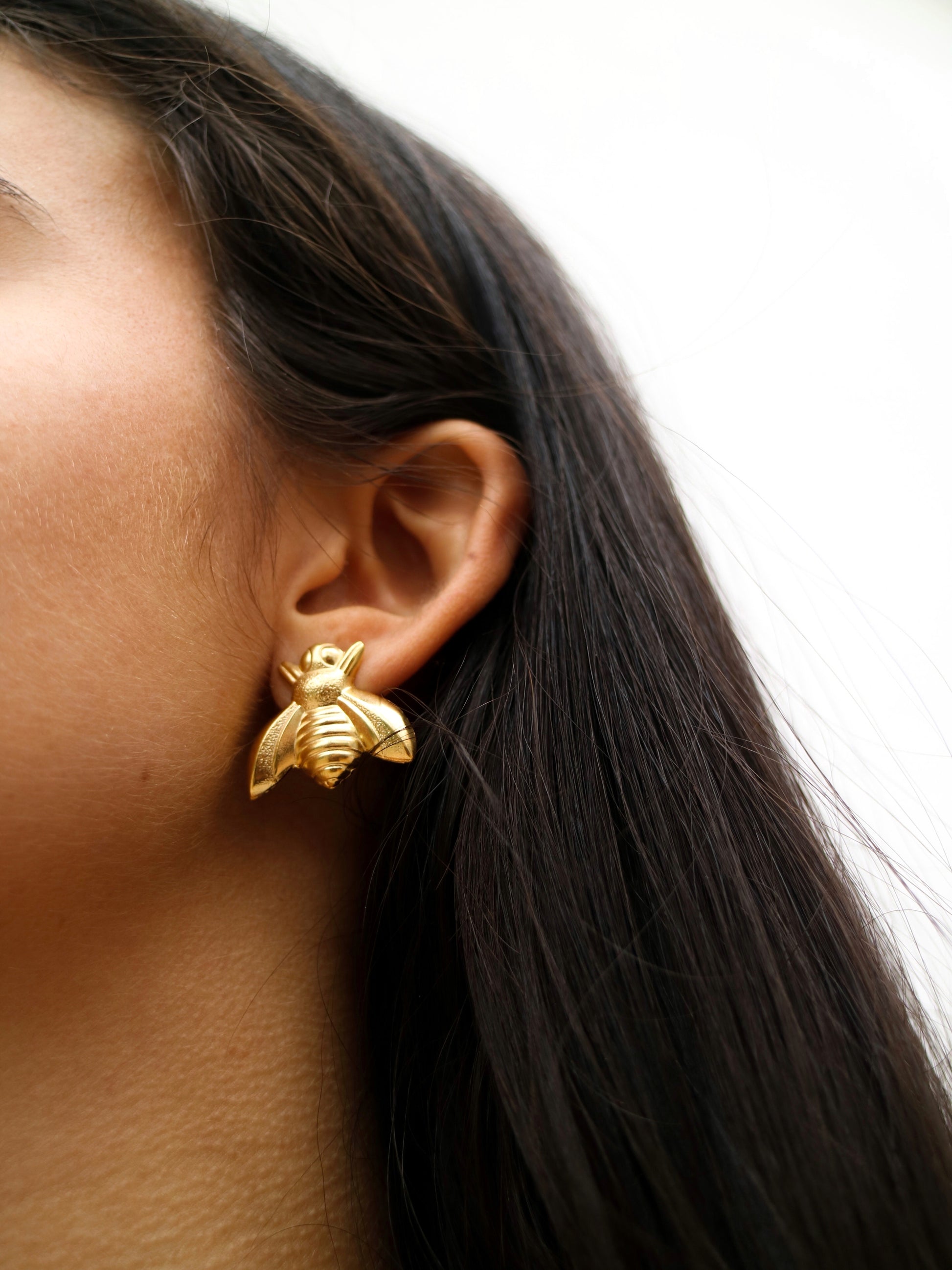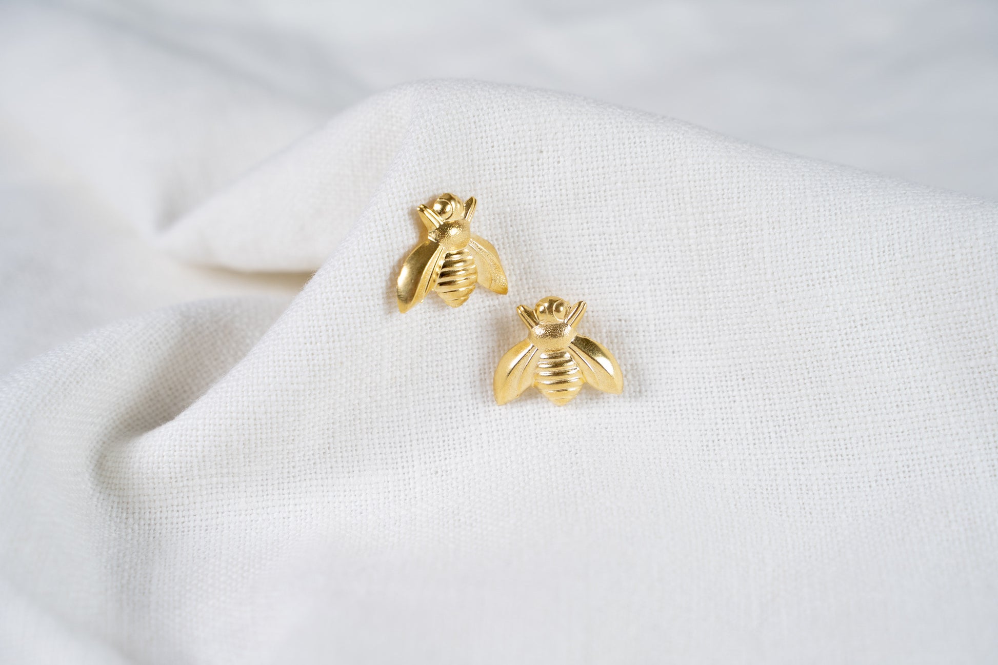 Pequeños pendientes dorados con forma de abeja sin aguijón.