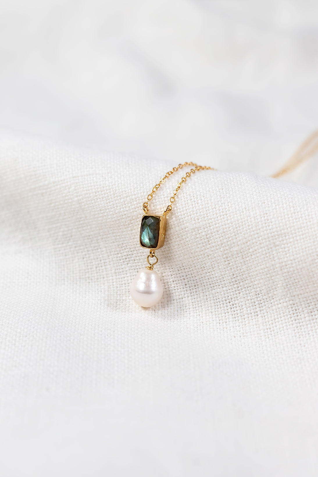 Colgante sencillo y elegante combinación de labradorita con perla. Bañado en oro 21k.