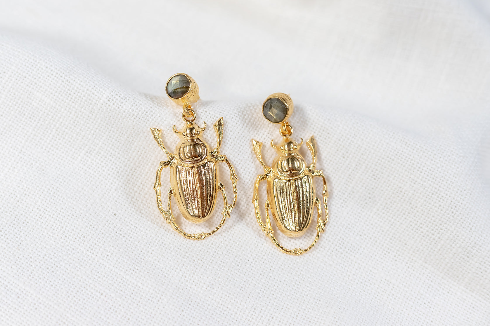 Pendientes en forma de escarabajo y piedra labradorita. Bañado en oro 21kt.