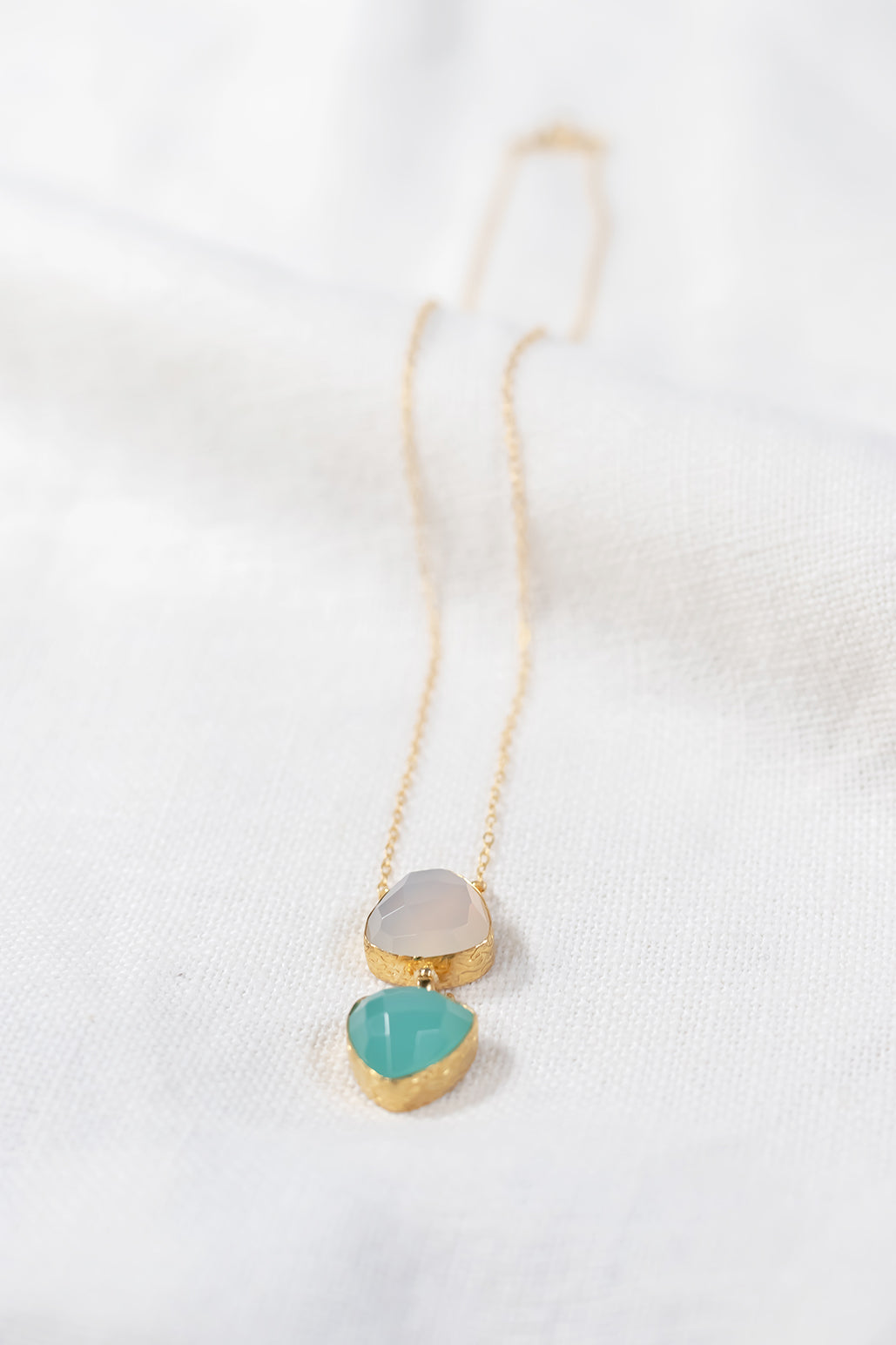Colgante compuesto por dos piedras en forma triangulada. Bañado en oro 21k.
