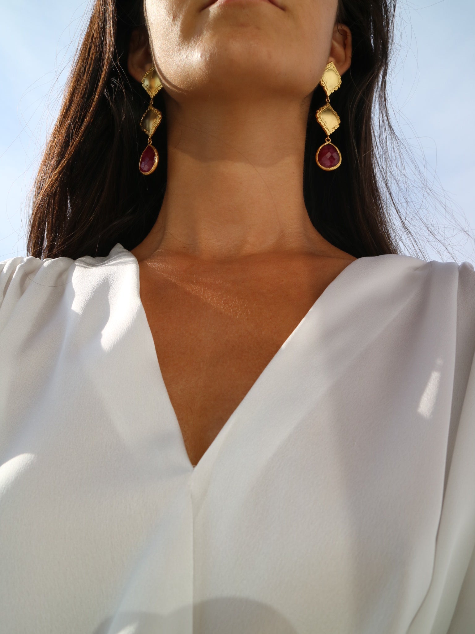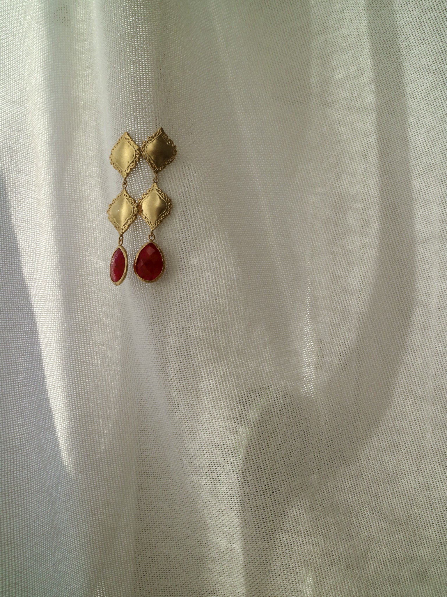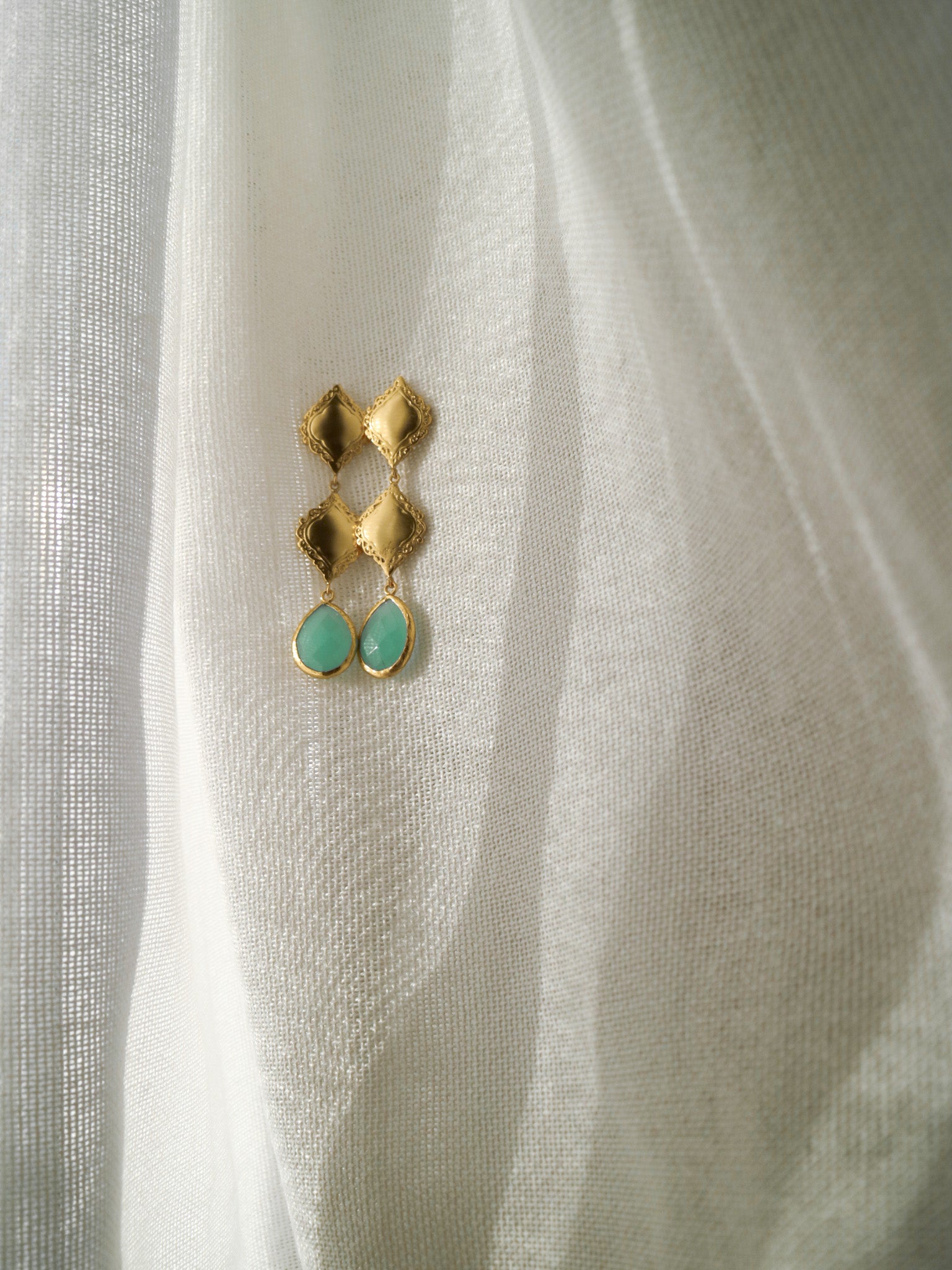 Pendientes de tres piezas con turquesa, lapislázuli u ojo de gato. Bañados en oro de 21kt.