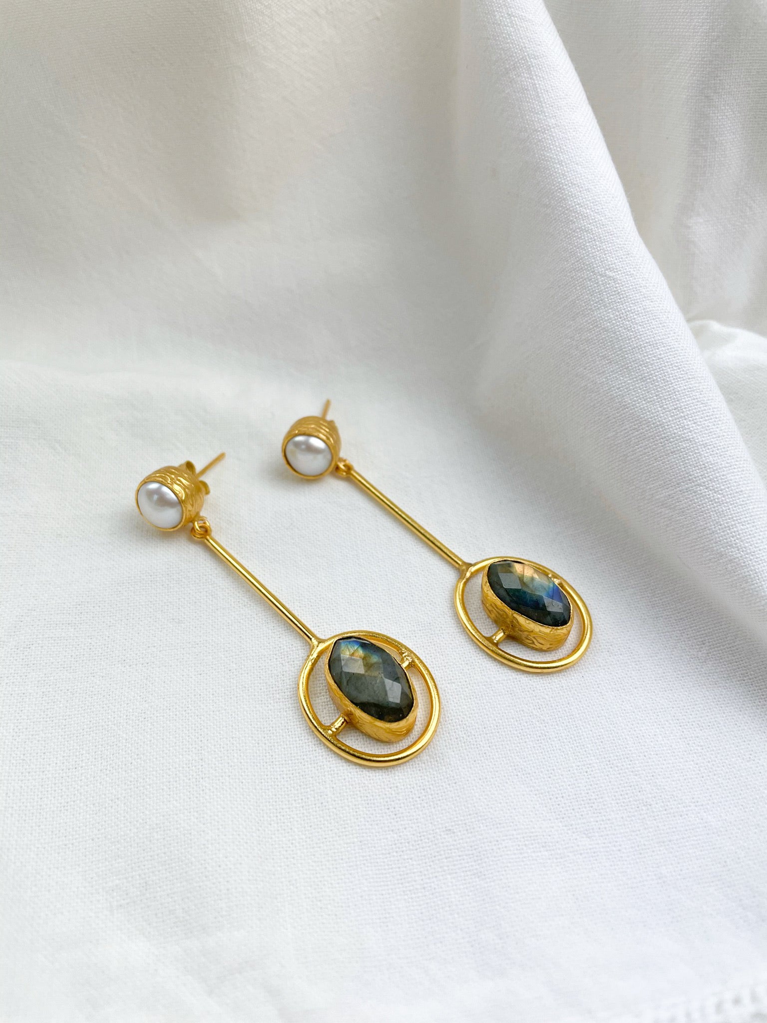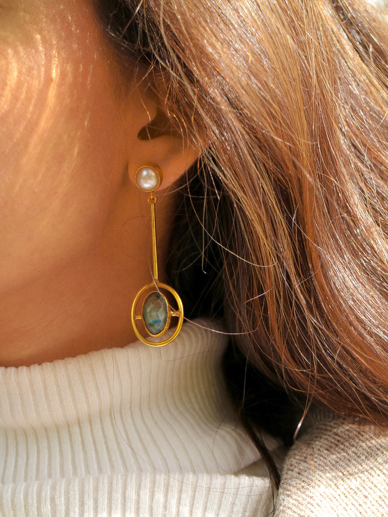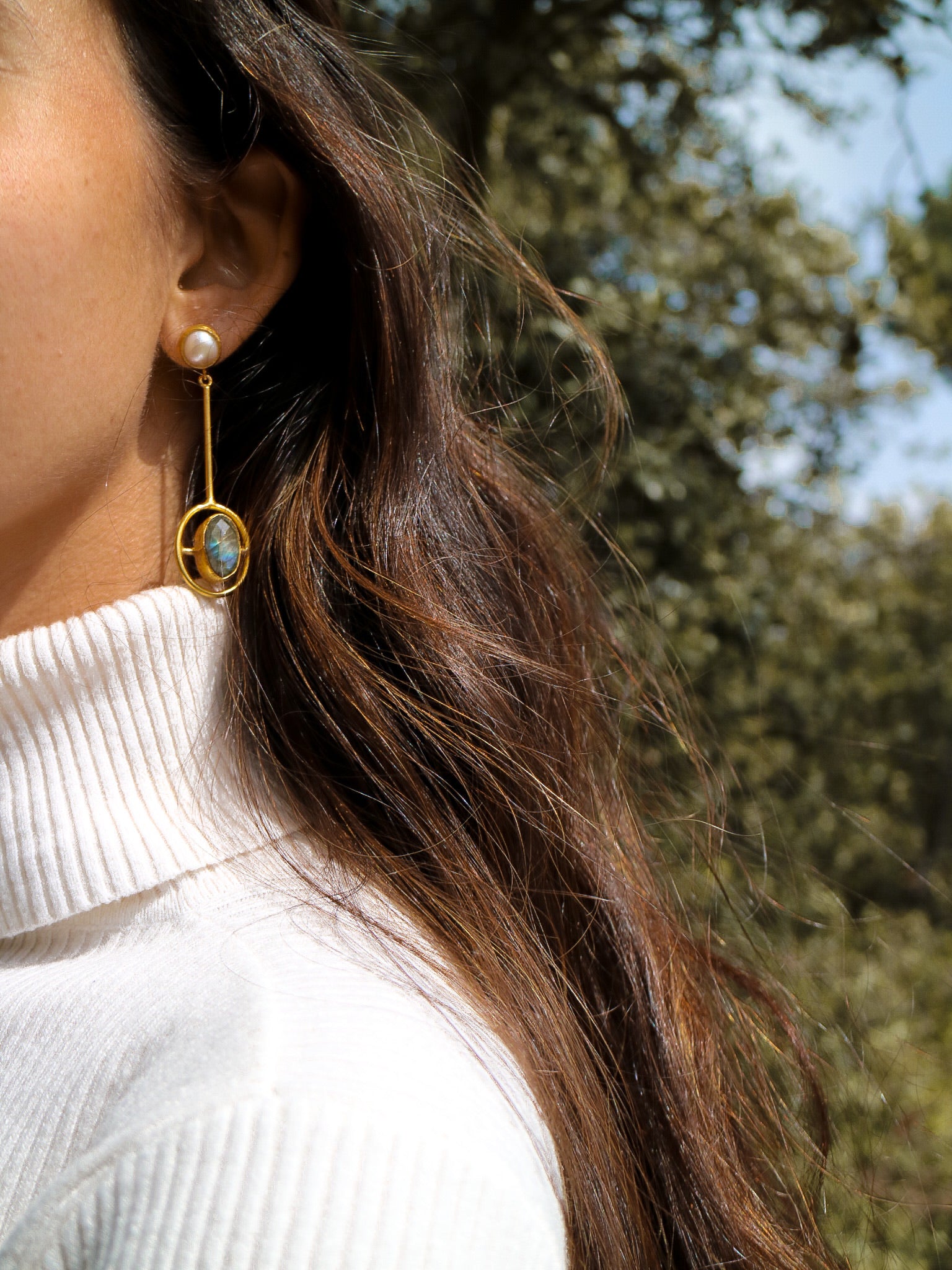 Pendientes con perla y labradorita bañados en oro de 21k.