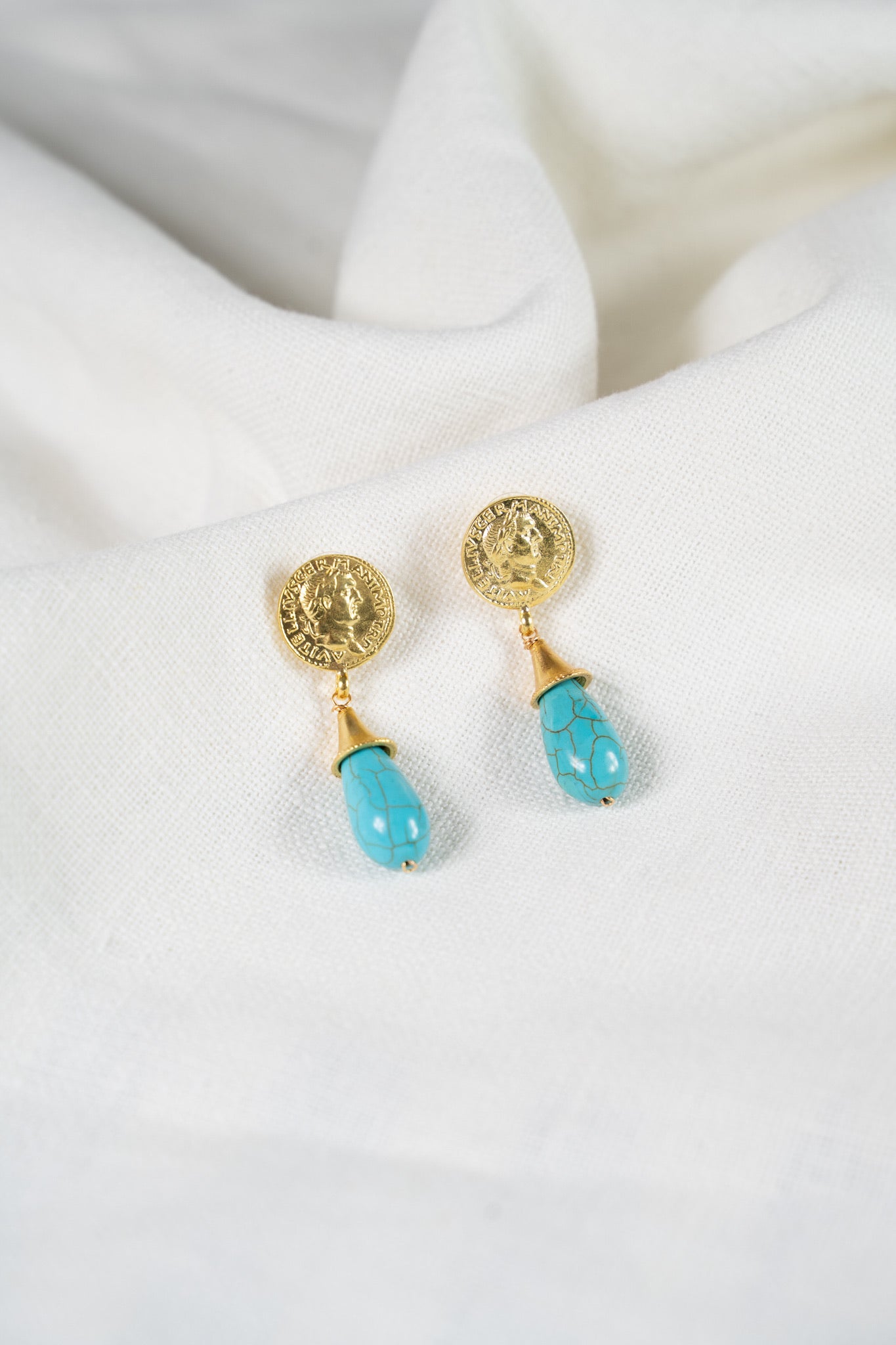 Pendiente en forma de moneda con piedra de color turquesa. Bañado en oro de 21kt.