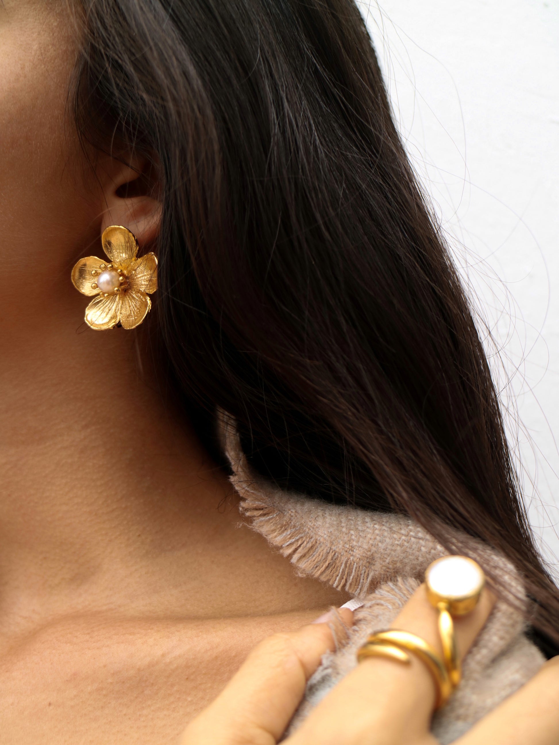 Pendientes dorados inspirados en la flor del ciruelo japonés con una pequeña perla en el centro.