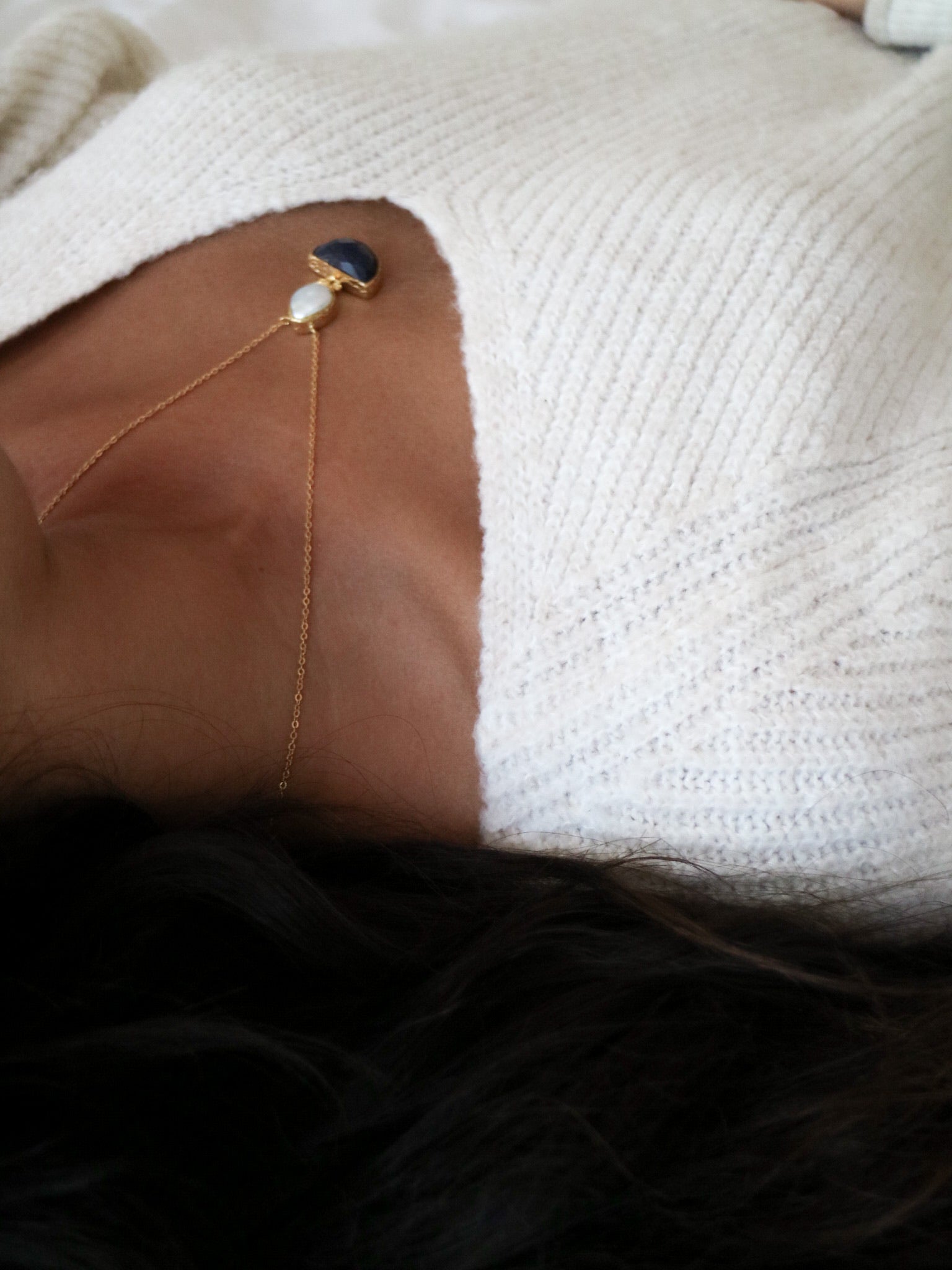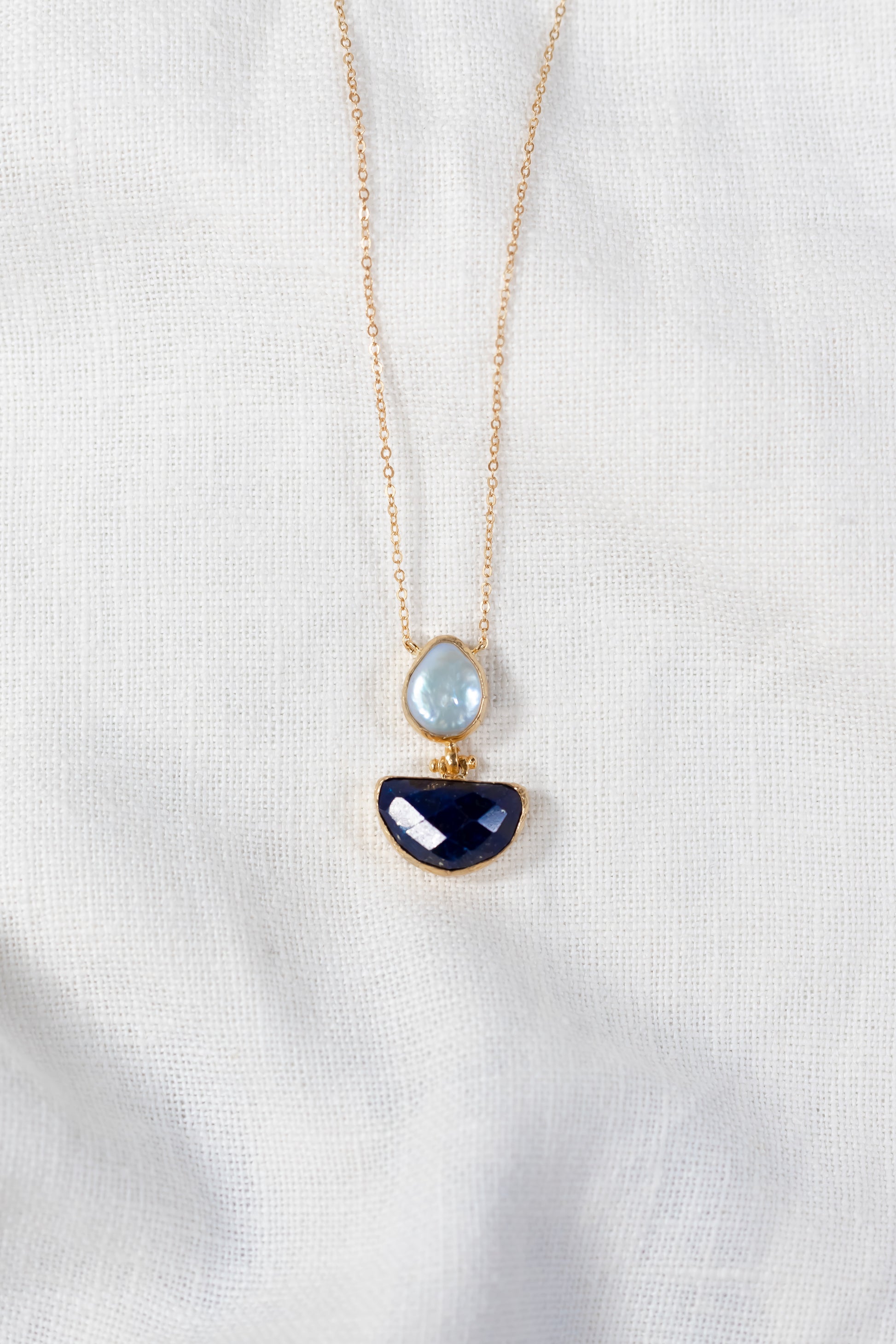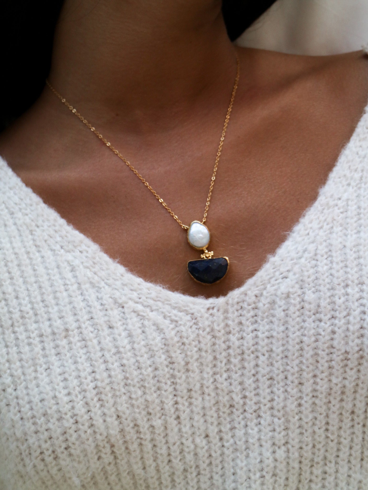 Colgante compuesto por una perla de forma circular y un lapislázuli en forma de media luna.