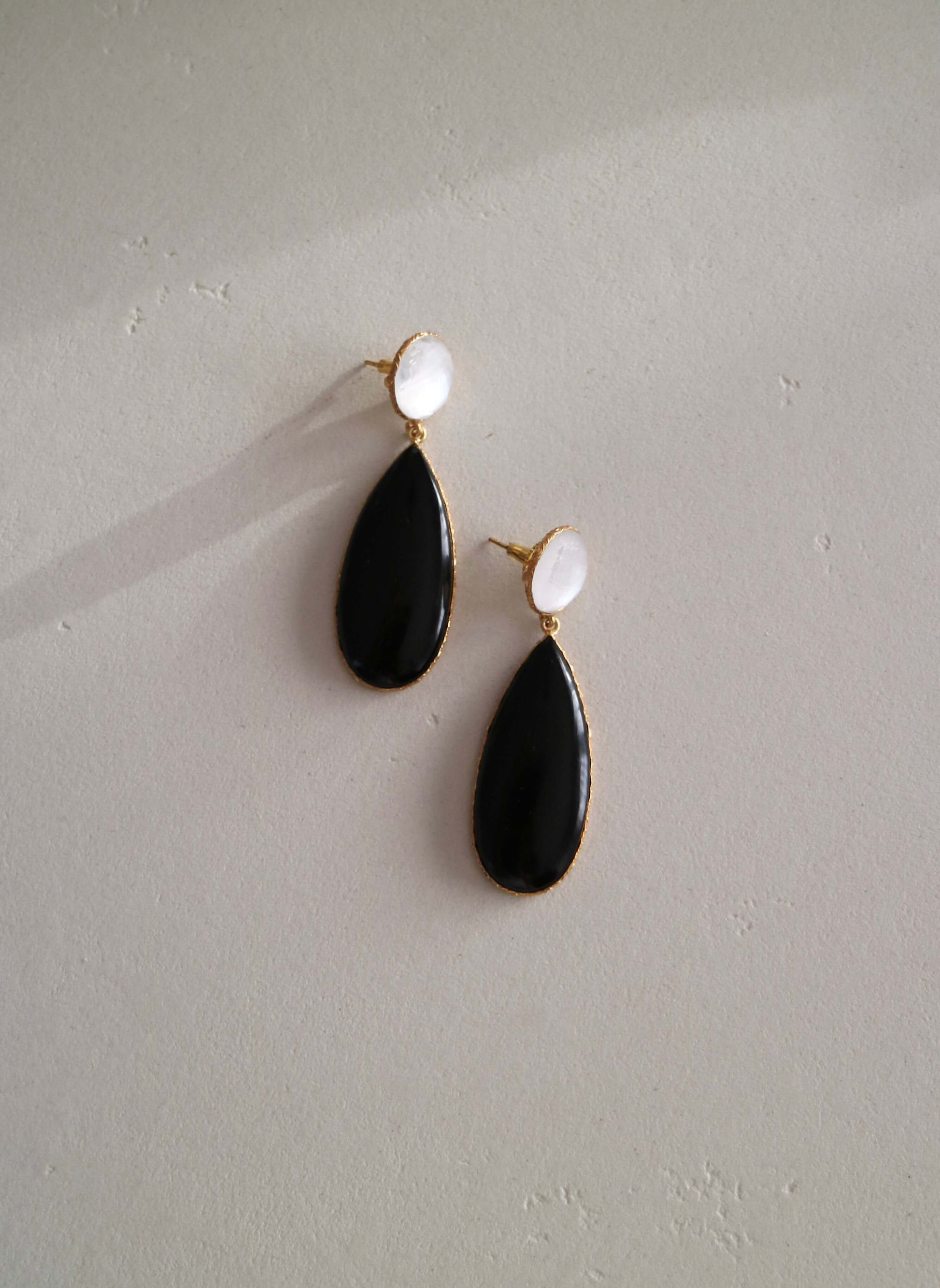 Pendientes colgantes con una piedra negra en forma de lágrima y una piedra blanca superior, inspirados en Alecto, una de las Erinias, diosa de la venganza y la justicia. Estos pendientes representan el equilibrio entre la oscuridad y la luz, el dolor y la esperanza. Una joya poderosa y expresiva, ideal para quienes buscan un toque de dramatismo y elegancia en sus accesorios. Perfectos para añadir carácter y significado a cualquier conjunto.