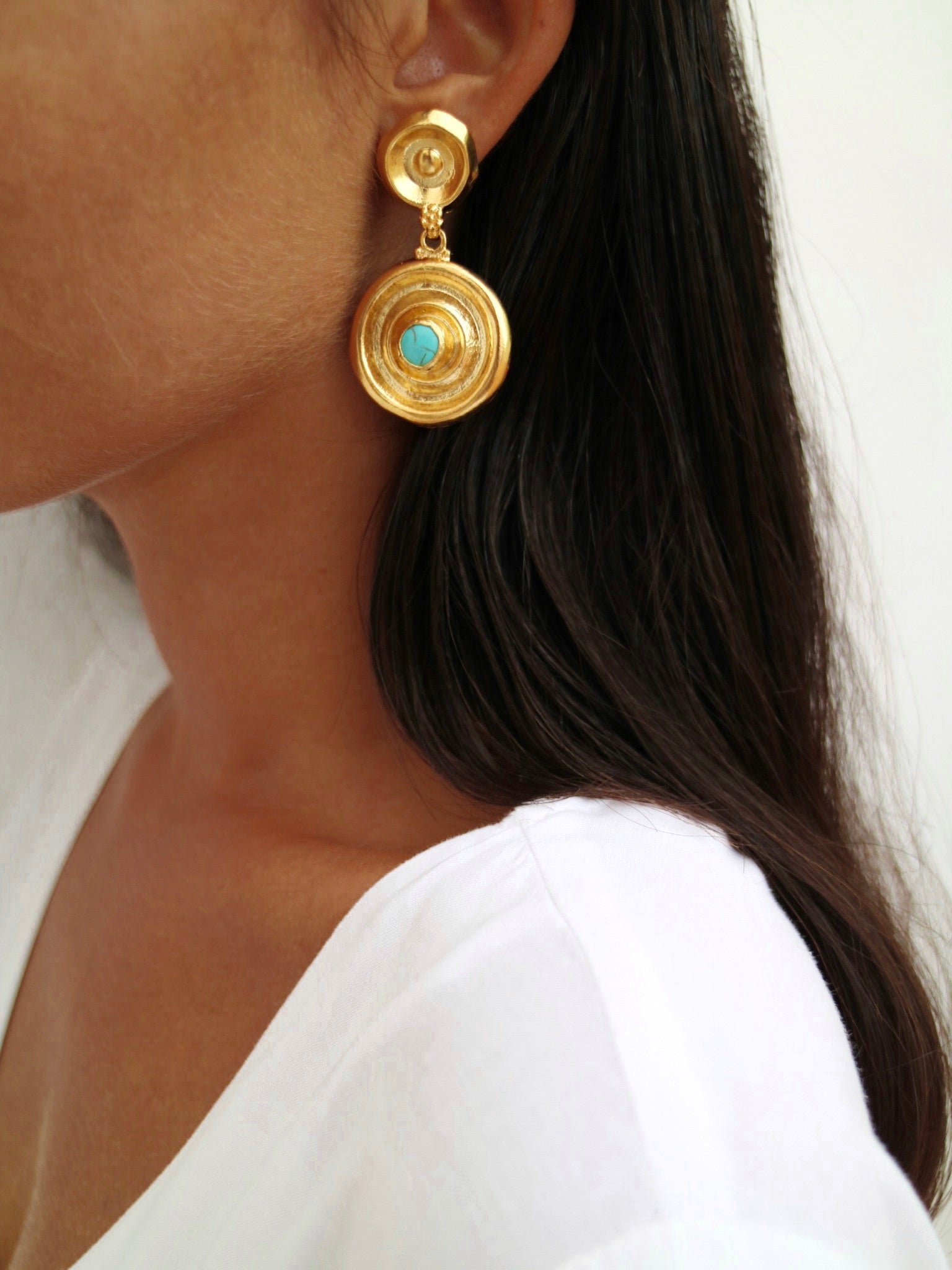 Pendiente en forma de esfera detallada con piedra turquesa central. Bañado en oro 21k.
