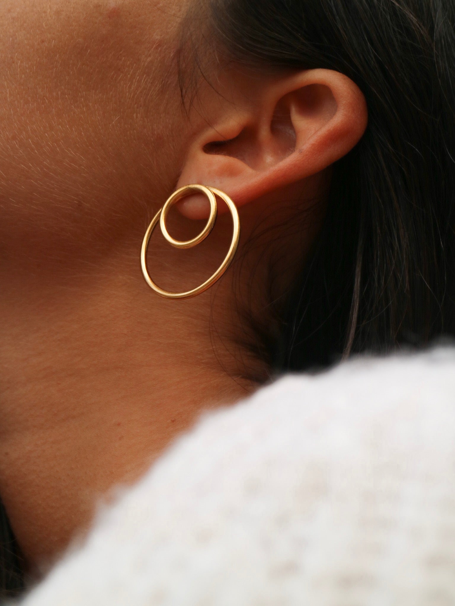 Bañados en oro de 21k sobre latón, estos pendientes tienen ese brillo cálido que se adapta a cualquier tono de piel. Los dos aros concéntricos crean volumen sin peso, siendo cómodos para llevar todo el día.
