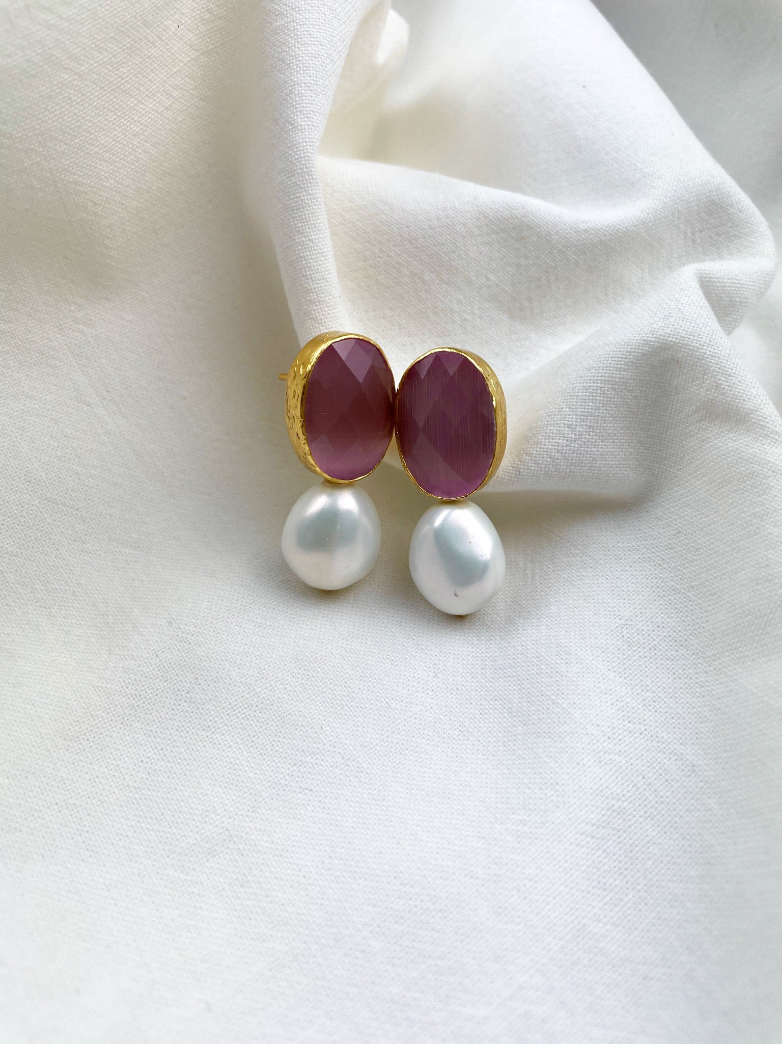 Pendientes con ojo de tigre y perla bañados en oro de 21k.