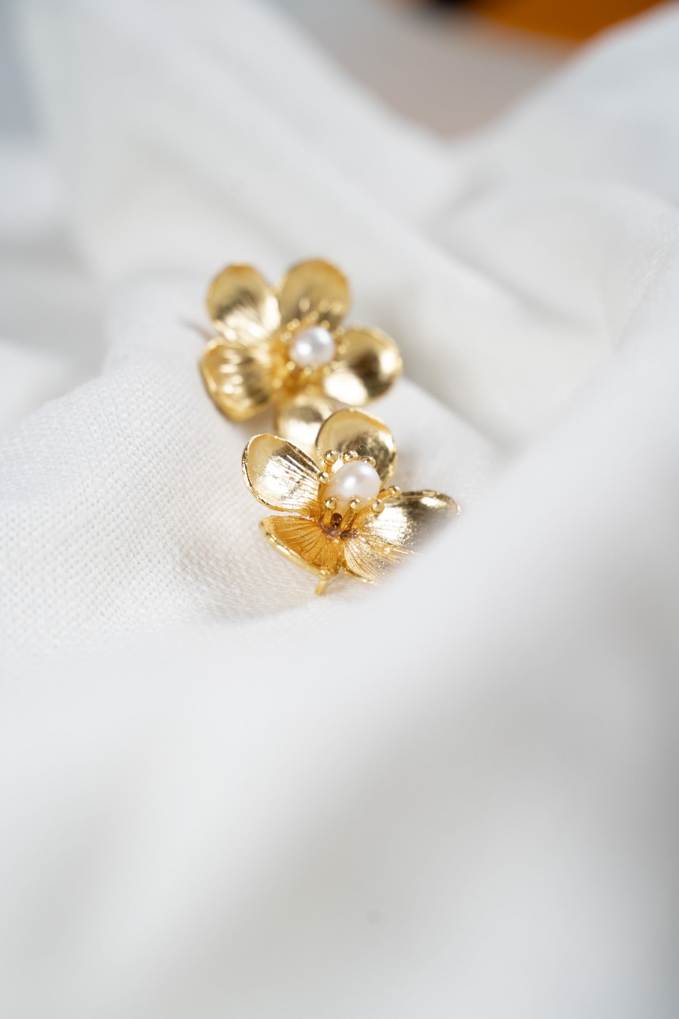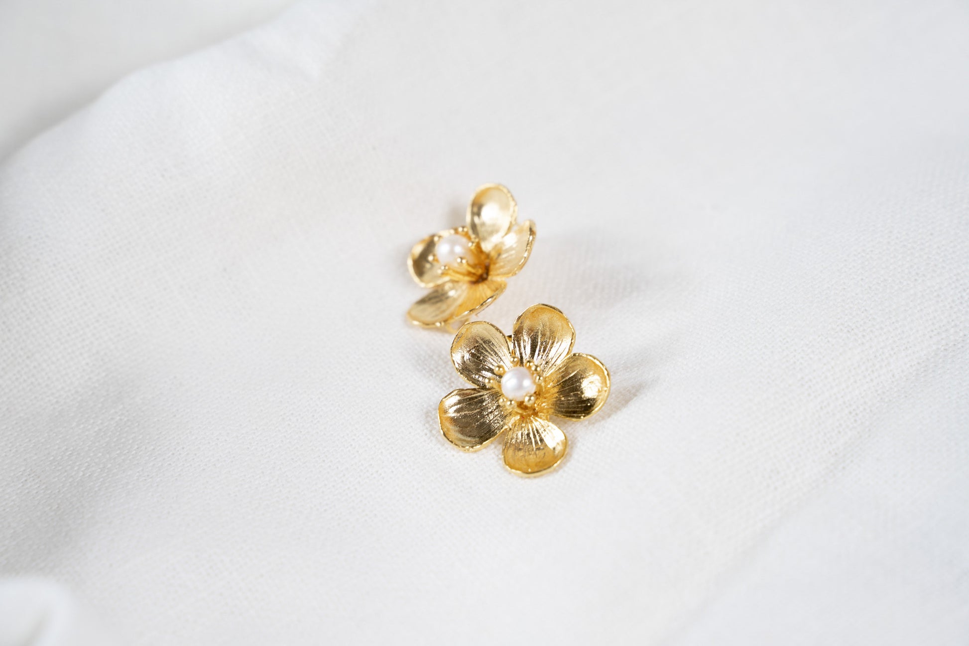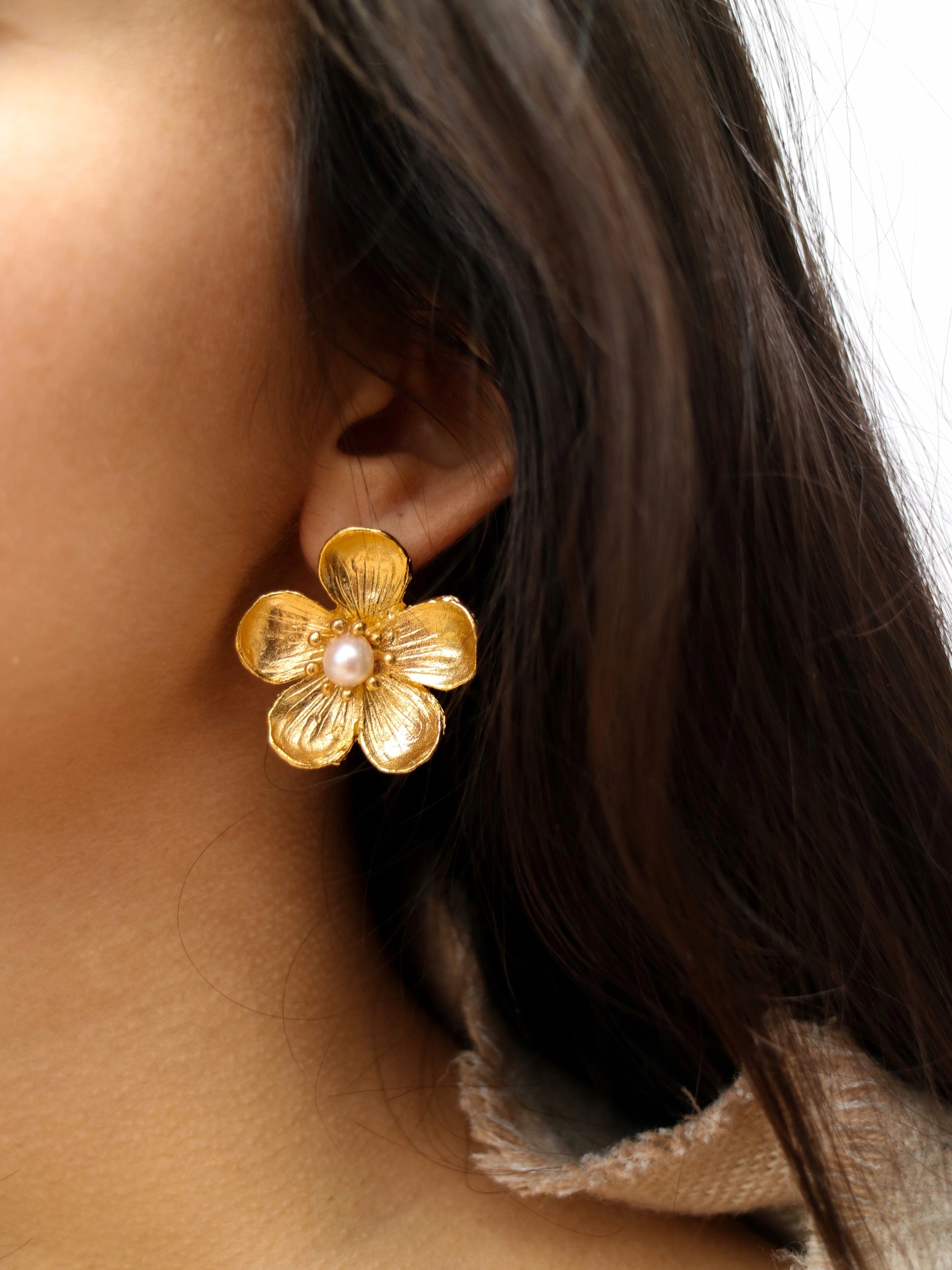 Pendientes dorados inspirados en la flor del ciruelo japonés con una pequeña perla en el centro.